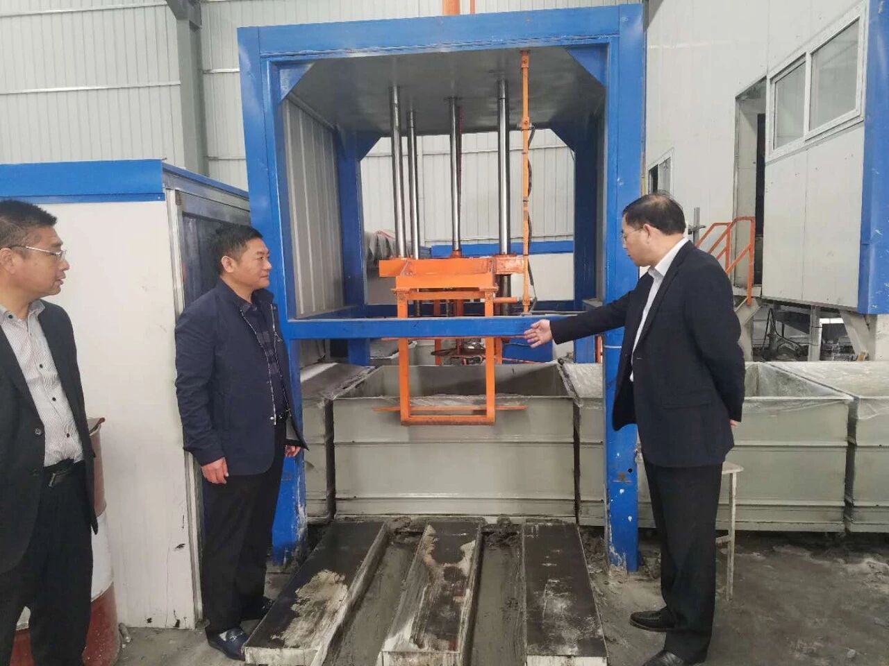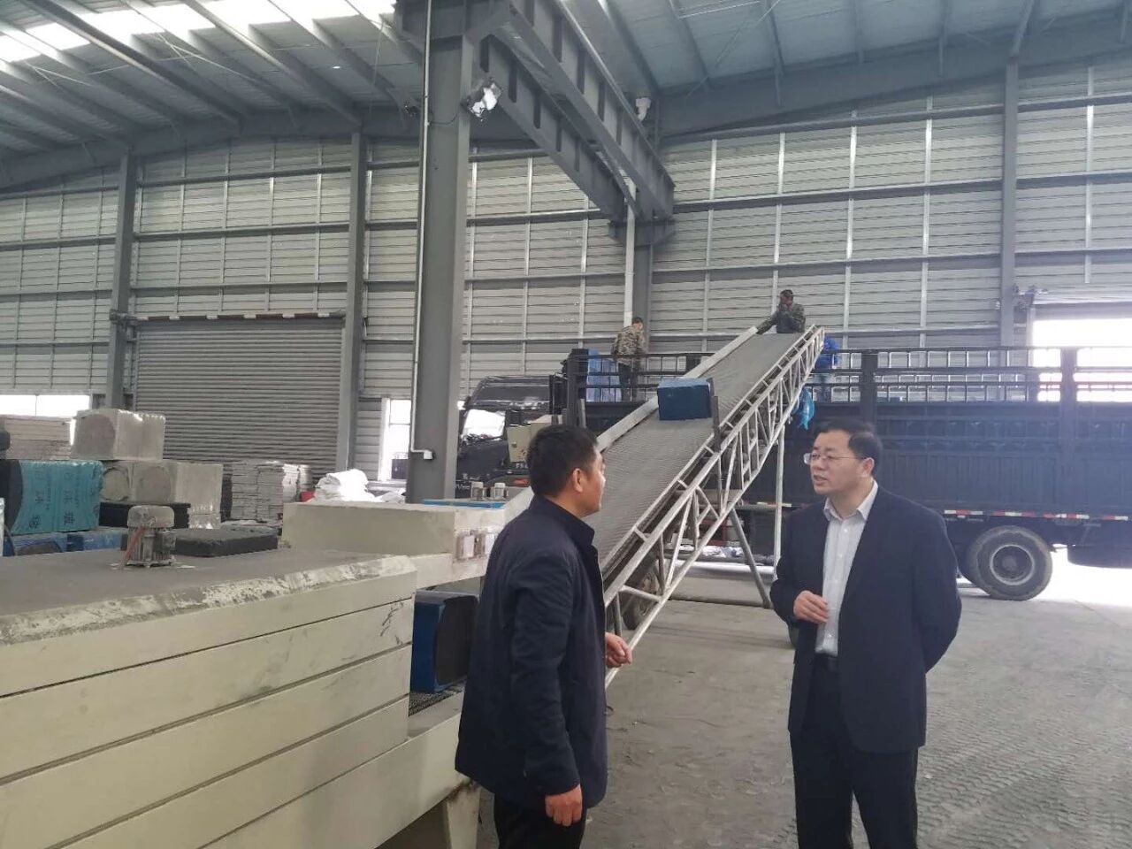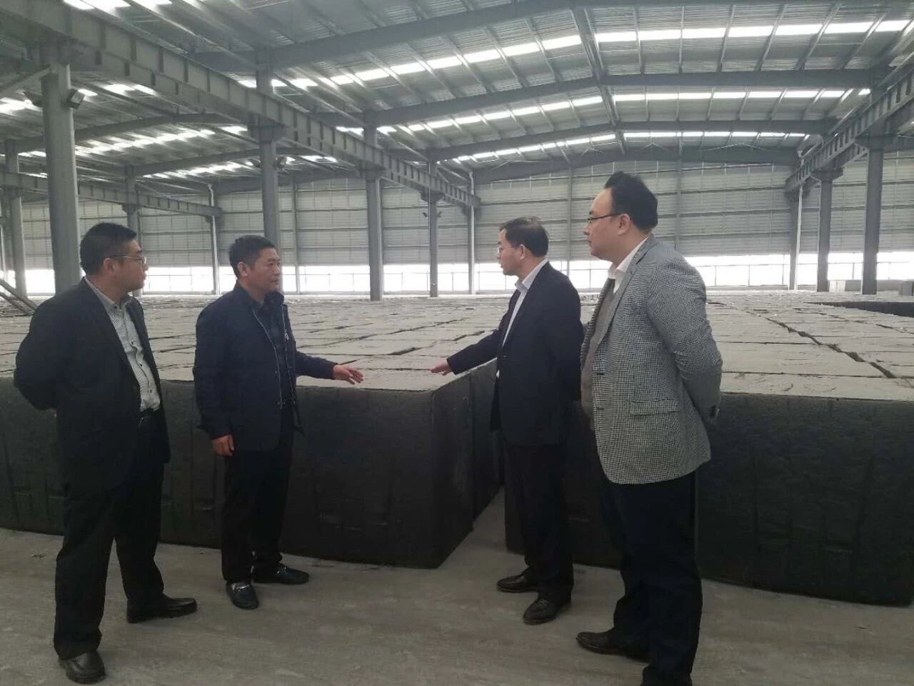 周克胜局长缓步于生产车间,饶有兴致地观摩了我司新建的国内发泡水泥板智能化示范生产线,仔细观察了保温板生产的各个工序,并耐心地听取了赵董对高性能防火保温板生产流程的介绍。