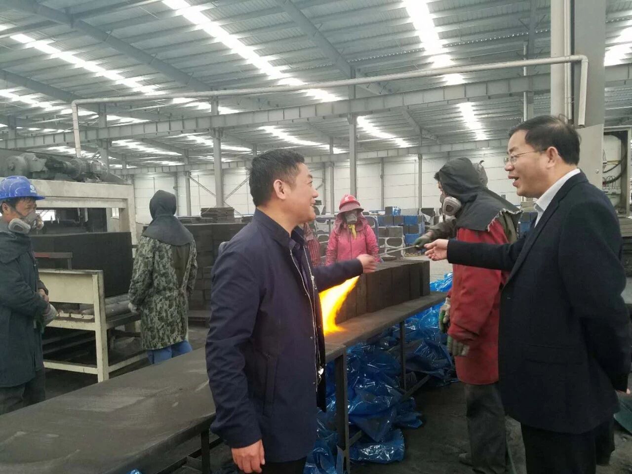 在生产现场,周局长被我司新研制的碳硅无机保温板所吸引。我司研制的碳硅无机保温板分为1型和2型,其中,1型的各项性能指标可与发泡板相媲美,而2型的各项性能指标亦可与发泡板争高下。碳硅无机保温板作为A高等防火保温材料具有强度高(2型>0.75mpa)、导热系数低(1型<0.05)、吸水率小(<3%)、与建筑物同寿命等特点,逐渐成为建筑保温市场上的新宠。